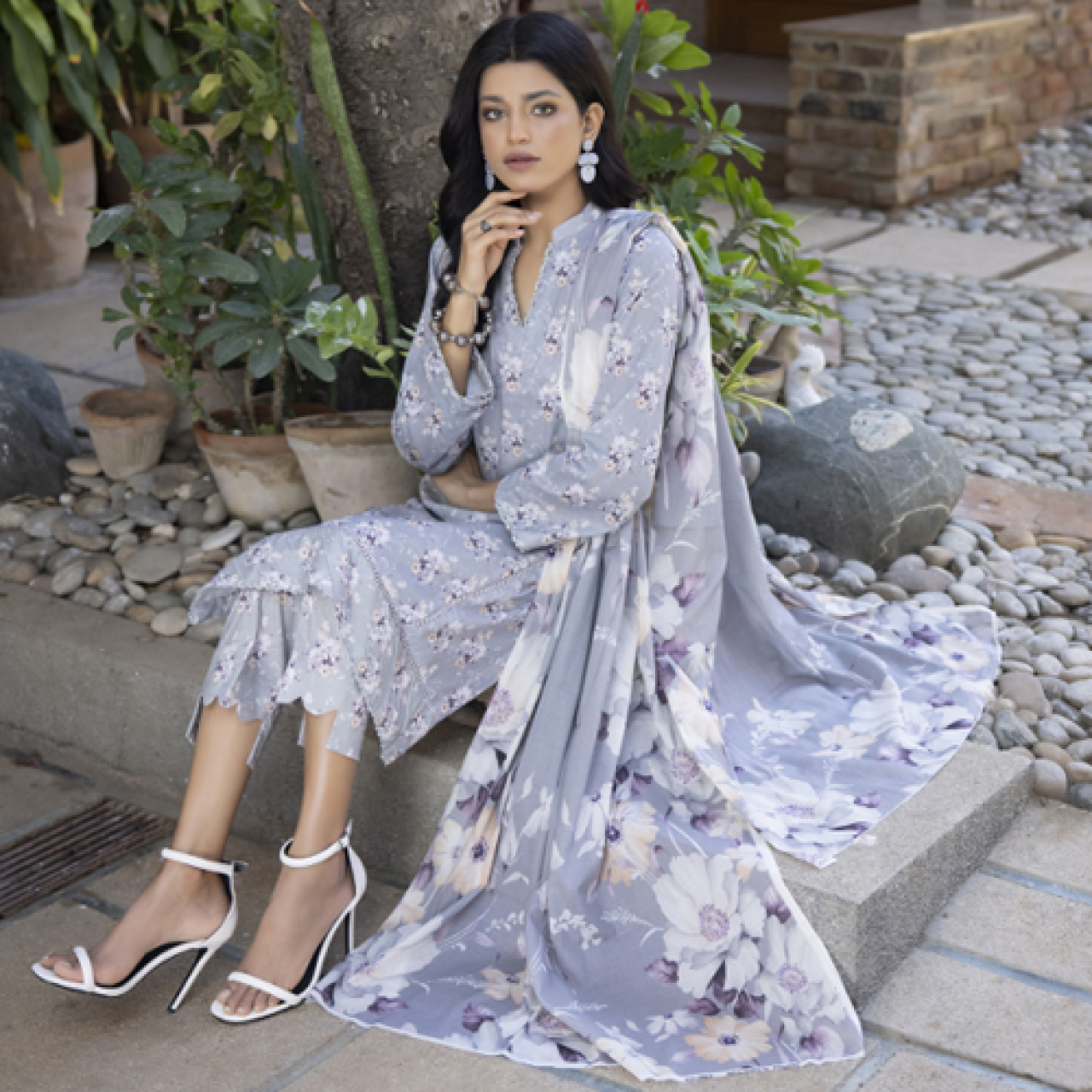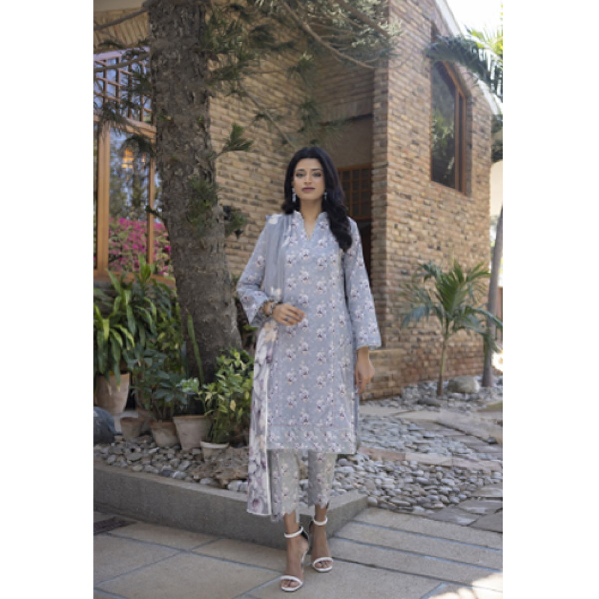 Identic 3 piece lawn outfit in grey with chiffon dupatta.